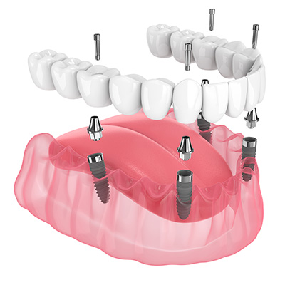 Précisons que même dans le cas d’un édentement total, il n’est pas nécessaire de réaliser autant d’implants qu’il y a de dents manquantes en bouche : dans la mâchoire inférieure, il est possible d’installer uniquement 4 à 5 implants, et 6 à 8 unités sur la mâchoire supérieure.