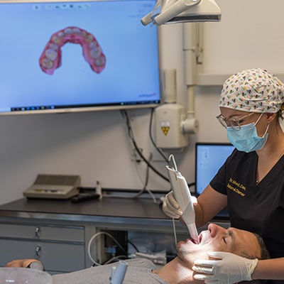 Nous pouvons utiliser notre scanner 3D, permettant une navigation virtuelle dans votre cavité buccale. Il s’agit d’un appareil de laboratoire d’une précision inégalée, très utile pour l’usinage de matériaux ainsi que pour la création d’empreintes 3D.