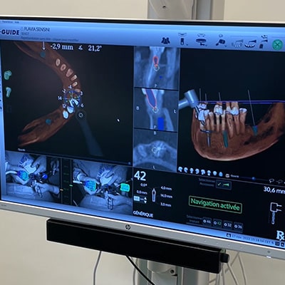 Notre équipement hautement technologique nous permet de bénéficier d’une chirurgie assistée par ordinateur : lors des opérations dentaires, votre dentiste peut ainsi être guidé par une machine ayant préalablement enregistré l’intégralité des informations relatives à la manipulation en cours.